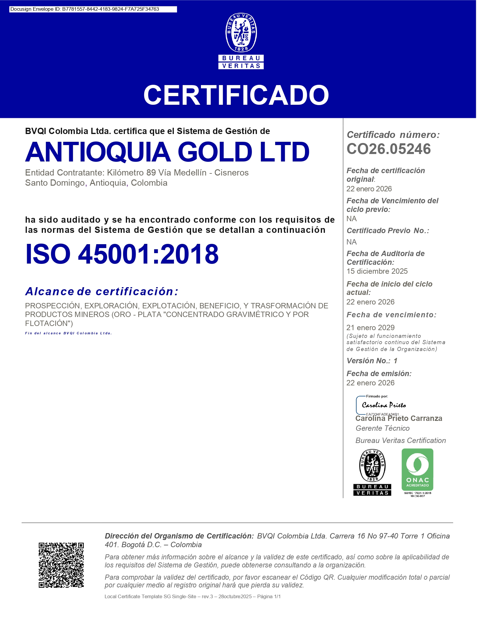 Antioquia Gold Ltd. ha sido certificada bajo la norma internacional ISO 45001:2018, otorgada por Bureau Veritas Certification, luego de un proceso de auditoría que confirmó el cumplimiento de los más altos estándares en Seguridad y Salud en el Trabajo.
